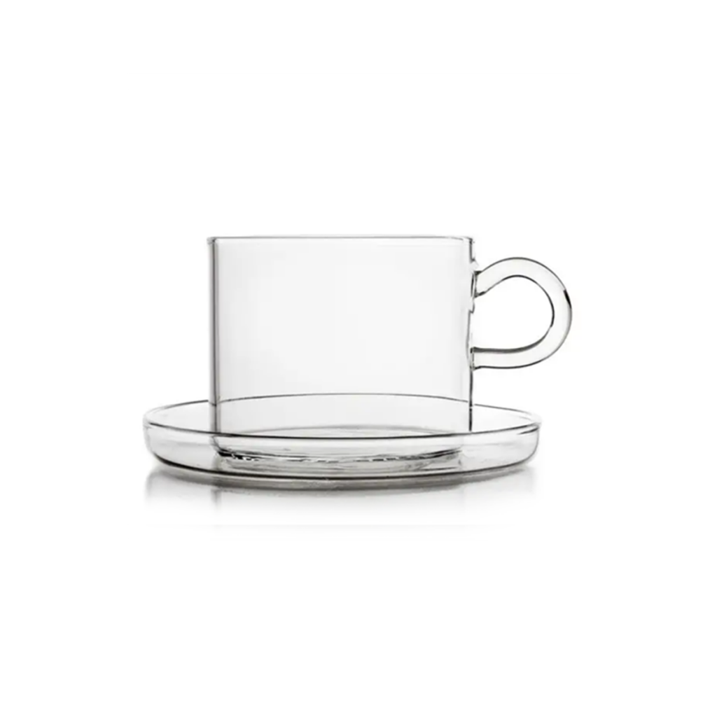 Piuma handgjord mugg med fat i naturligt borosilikatglas, designad av Marco Sironi.