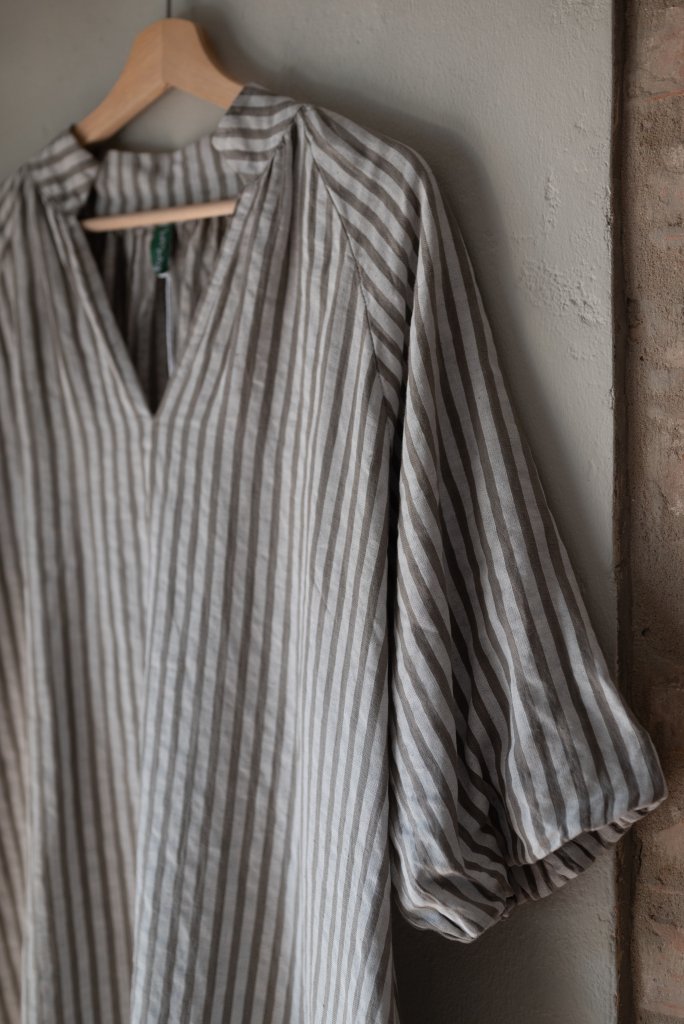 En randig klänning med mycket vidd och naturlig elegans.