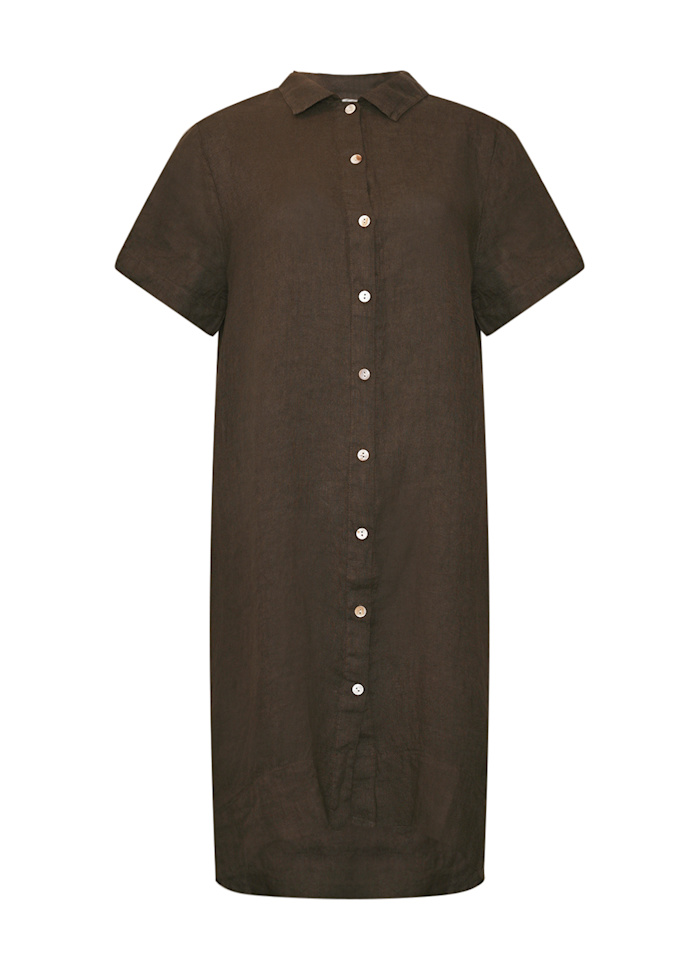 Vår klänning är tillverkad av 100% linne och har långa ärmar och knappar framtill.