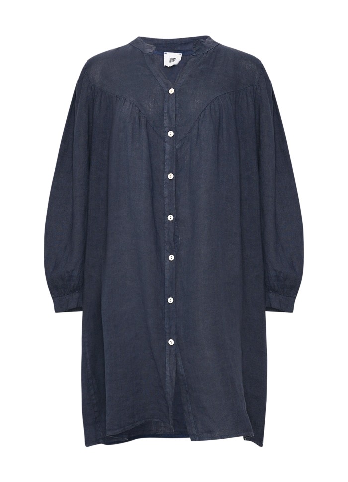 Vår klänning är tillverkad av 100% linne och har långa ärmar och knappar framtill.