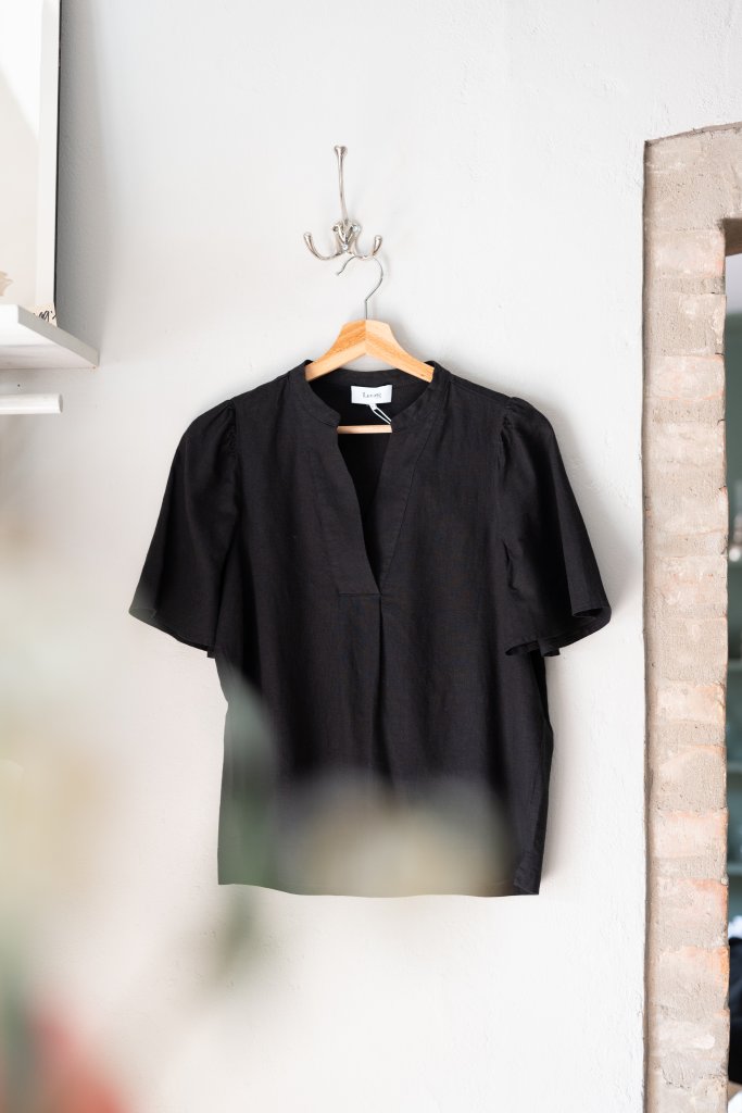 LR-NAJA 32 från Leveté Room. Enblusmedavslappnadpassformtillverkadienhärligblandningav linneoch viskos.DennatoppharV-ringningochkortaärmar,medettlätt,texturerattygsomdraperarelegantförensmickrandesilhuett.Kombineradenmedskräddarsyddabyxorellerenblommigkjolförattskapaensofistikeradlookförbådeprofessionellaochavslappnademiljöer.