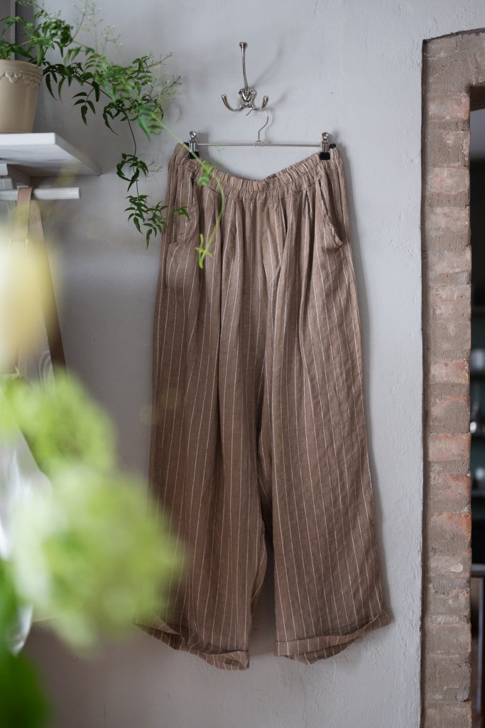 Härlig beige och vitrandig linnebyxa med resår i midjan. Styla med kavaj i samma stil.
