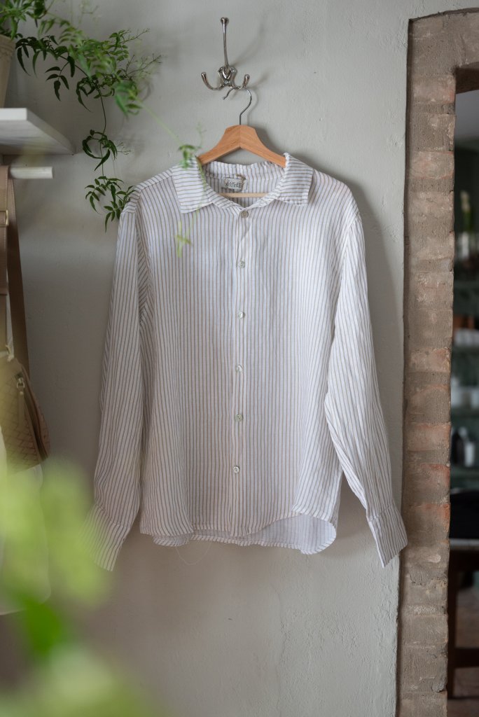 Härlig vit och beige randig linneskjorta. Styla med byxor i samma stil för en skön avslappnad stil.