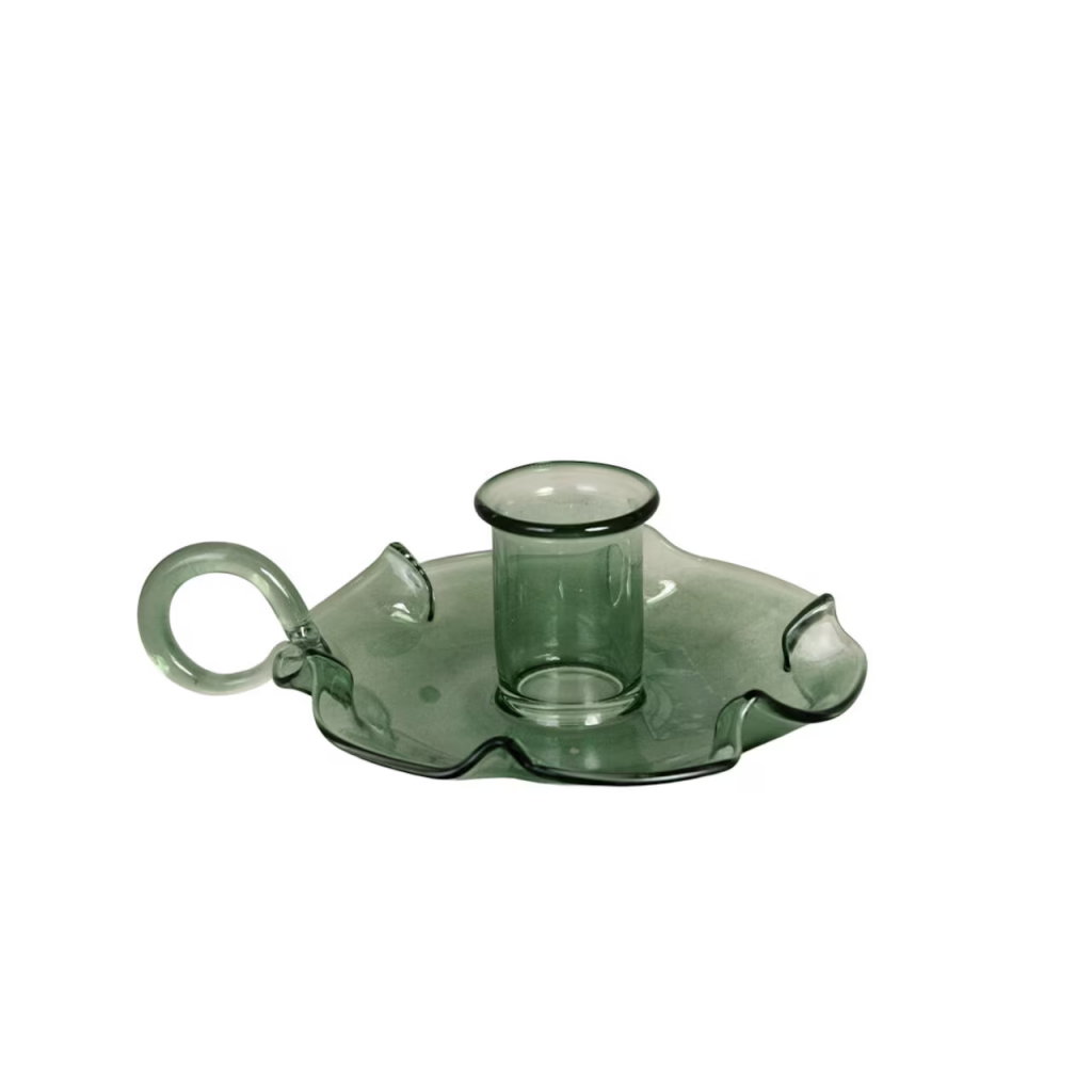 Elegant ljusstake i glas med mjukt vågiga kanter och ett litet öglehandtag. Med sin djupgröna färg ger den en varm och mysig atmosfär till alla utrymmen. Finns i två färger. Ej diskmaskinssäker.