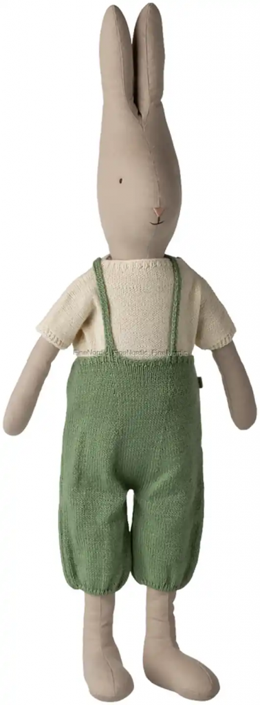 Söt kanin från Maileg med stående öron. Denna fina kanin har stickad tröja och hängslebyxor.