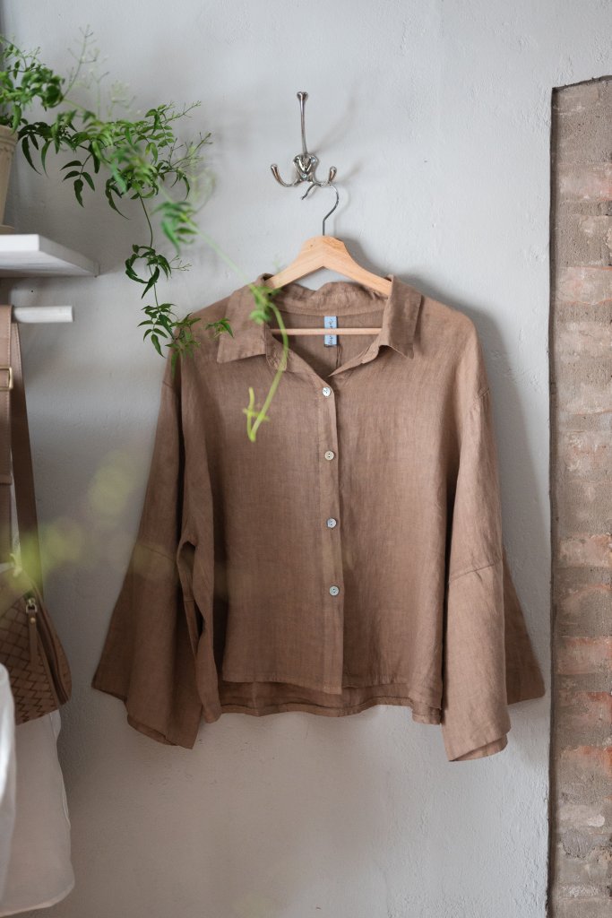 Härlig kanelfärgad linneblus med vida ärmar med slits. Kombinera med sköna linnebyxor i samma stil.