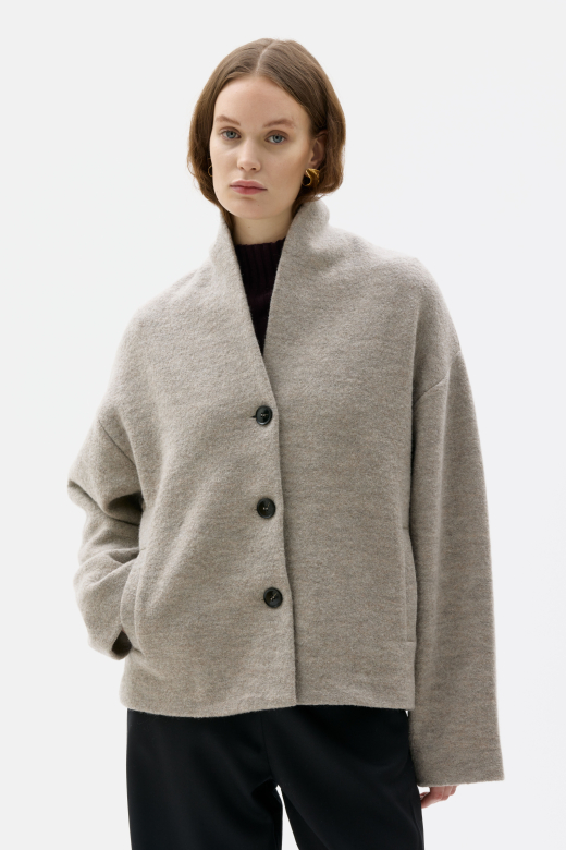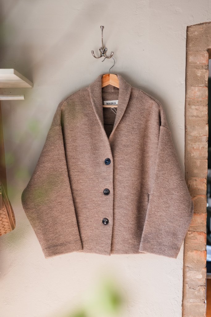 Hale är en mysig och överdimensionerad jacka i kokt ull med nedsänkta ärmhål, en iögonfallande sjalkrage och tre matchande knappar i bioresin för en knäppning framtill. Jackan har även passpoalfickor fram och rena invändiga detaljer. Tillverkad av 100 % högkvalitativ kokt italiensk ull, passar denna jacka perfekt med en grovstickad tröja för en lager-på-lager-mysig höstlook. - Denna ull är en obehandlad, stark toppull från Italien som är 26 μ. Plagg i detta garn har stickats i paneler som sedan kokas och tovas. Tack vare denna process blir plaggen ännu mer hållbara och slitstarka, vindtåliga, smuts- och vattenavvisande och isolerande. Tjockleken beror på stickstrukturen.