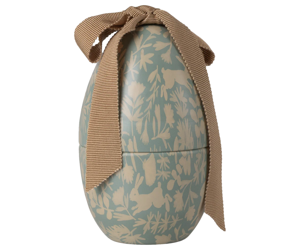 Mailegs påskägg har ett vackert nytt heltäckande tryck. Ta en ordentlig titt på trycket och se om du kan hitta de olika djuren. Ägget har en stor mjuk rosett på toppen som ger ägget ett exklusivt utseende.