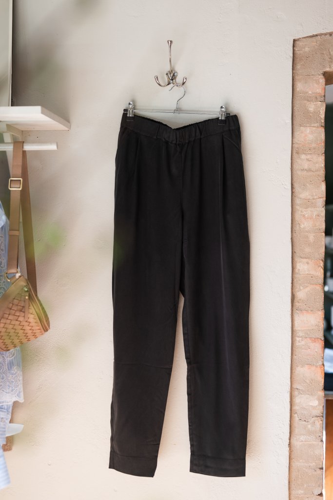 Avsmalnande byxor med elastisk midja tillverkade i stentvättad tencel med en persikoliknande känsla. Veck och två snedställda sidofickor fram. Bekväm passform med normal hög midja och förstärkt mitt bak i sömmen för hållbarhet. Tyget är medeltjockt, specifikt valt för användning året runt. Det har blivit en älskad ikonisk MASKA-modell och säsongslös bästsäljare. Kombinera med en tröja på hösten och en linneskjorta på våren.